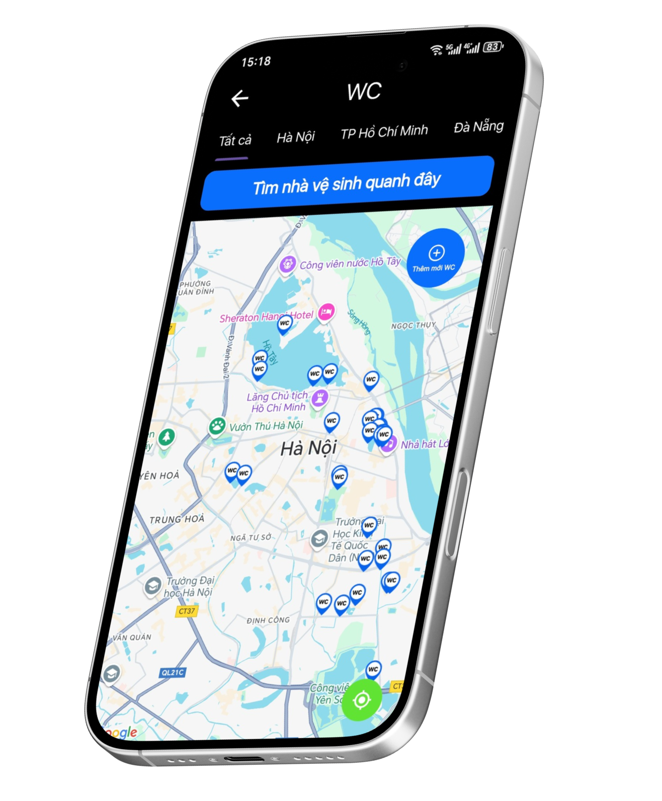 Du khách có thể "Tìm kiếm nhà vệ sinh quanh đây" theo toạ độ của bạn hoặc tìm kiếm nhà vệ sinh theo tỉnh thành phố.