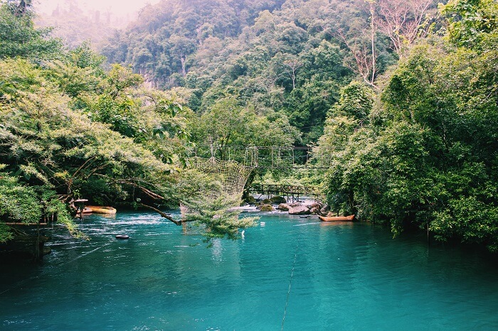Suối Nước Moọc nằm trong vườn quốc gia Phong Nha Kẻ Bàng cách thành phố Đồng Hới khoảng 60 km. Để đến đây bạn có thể đi theo trục đường mòn Hồ Chí Minh, con suối chảy ra sông Côn về miền đồng bằng. Đến ngã ba Khe Gát bạn rẽ về hướng Tây đi khoảng 5 km nữa là đến suối Moọc. Suối nước được bao phủ bởi rừng xanh đại ngàn, khí hậu mát mẻ, độ ẩm không khí cao. Mùa hè du lịch tới đây rất thích hợp, bạn sẽ có cảm giác như lạc vào một chiếc điều hòa khổng lồ của thiên nhiên. Suối Nước Moọc Quảng Bình bắt nguồn từ một hồ nước lớn rộng khoảng 80 – 90 m vuông, phía dưới hạ nguồn dòng suối đổ ra sông lớn. Ở đây có nhiều bãi đá lô nhô gập ghềnh tạo nên cảnh quan kỳ thú. Dọc theo dòng suối những tán cây tỏa bóng tràn ra giữa dòng như những chiếc ô chùm lên mặt nước. Cây cối mọc xanh tốt có tác dụng giữ nước, giữ độ ẩm làm không khí thanh mát, trong lành. Suối Nước Moọc hiện ra trong khung cảnh thiên nhiên hoang dã rừng sâu, khách du lịch như bị choáng ngợp cảnh đẹp trước mắt. Từng con nước, cành cây ngọn cỏ xanh non căng tràn sự sống, âm thanh râm ran của thiên nhiên hòa trong tiếng nước chảy tạo thành bản hợp giao sinh động. Trên dải đất hình chữ S này có những nơi con người và thiên nhiên có thể hòa hợp gần gũi đến như vậy. Bạn có thể thả hồn vào không gian rừng núi tận hưởng cảm giác thư thái, căng rộng hết các giác quan để nghe, để nhìn ngắm, để cảm nhận hương thơm của sự sống. Đến đây bạn còn được tham gia vào nhiều hoạt động vui chơi giải trí, có rất nhiều trò chơi cảm giác mạnh, đòi hỏi sự dẻo dai khéo léo của người chơi: Chèo thuyền Kayak, đi cầu treo, zipline … Ngồi trên thuyền Kayak khéo léo điều khiển mái chèo theo dòng nước đến những đoạn chảy siết người chơi phải gồng mình lên để giữ mái chèo vượt qua dòng nước mạnh. Gía vé chèo thuyền Kayak tại suối nước Moọc mỗi lượt chơi giá khoảng 50.000 VNĐ. Đi cầu treo dành cho những người không sợ độ cao, nhón từng bước chân thận trọng trên từng thanh gỗ cầu treo nếu không muốn bị rơi xuống nước. Không chỉ cẩn thận bạn còn phải rất khéo léo để tham gia trò giải trí này. Ở đây có phục vụ rất nhiều món ăn dân dã được chế biến từ những nguyên liệu bản địa: Rau rừng xào tỏi, cá chình nướng, gà nướng, cháo canh. Ngồi trên những lán nhà lá thưởng thức các món ăn đem đến cảm nhận vô cùng mới lạ. Vào mùa hè suối Moọc thực sự trở thành một khu sinh thái tuyệt vời, nước suối trong mát, cảnh vật tươi mới. Cùng bạn bè đến đây picnic ngày cuối tuần, dịp lễ sẽ là một ý tưởng tuyệt vời, thiên nhiên hoang dã sẽ cho bạn những bức ảnh kỉ niệm đáng nhớ. Điểm du lịch khá mới nên mọi thứ dường như “còn nguyên”, dường như tách biệt với cuộc sống bên ngoài. Ngoài ra bạn có thể tham quan các điểm gần suối Moọc như sông Chày, hàng Tối. Hang Tối có những dòng nước ngầm sâu chảy qua tạo ra sự điều hòa không khí. Bên trong có nhiều khối thạch nhũ đá đa hình thù và hầu như không có ánh sáng, bóng tối kín đặc, nếu tắt đèn pin đi cảm tưởng mọi thứ như bị bóng tối nuốt trọn, trước mắt một màu đen đến nghẹt thở.